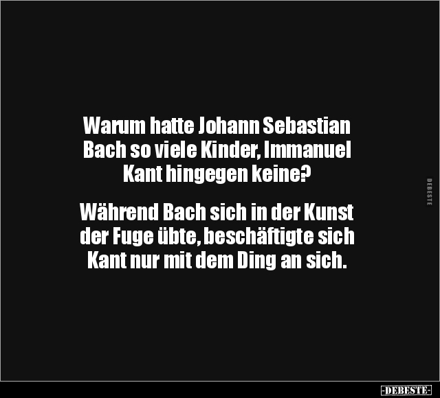 Warum hatte Johann Sebastian Bach so viele Kinder, Immanuel Kant hingegen keine? Während Bach sich in der Kunst der Fuge übte, beschäftigte sich Kant nur mit dem Ding an sich.