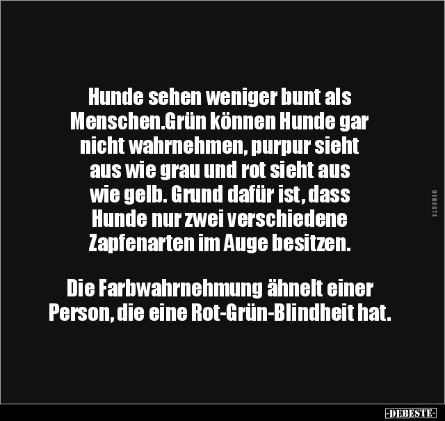 Hunde sehen weniger bunt als Menschen.Grün können Hunde gar nicht wahrnehmen, purpur sieht aus wie grau und rot sieht aus wie gelb. Grund dafür ist, dass Hunde nur zwei verschiedene Zapfenarten im Auge besitzen. Die Farbwahrnehmung ähnelt einer Person, die eine Rot-Grün-Blindheit hat.