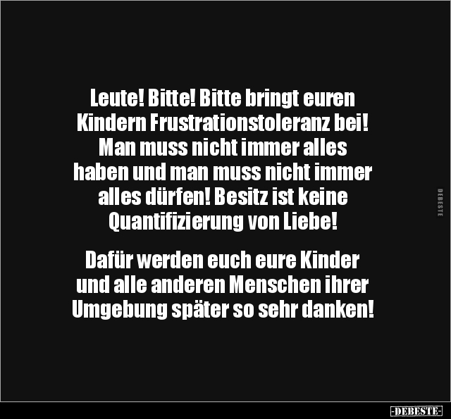 Leute! Bitte! Bitte bringt euren Kindern Frustrationstoleranz bei! Man muss nicht immer alles haben und man muss nicht immer alles dürfen! Besitz ist keine Quantifizierung von Liebe! Dafür werden euch eure Kinder und alle anderen Menschen ihrer Umgebung später so sehr danken!