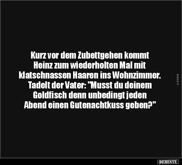 Kurz vor dem Zubettgehen kommt Heinz zum wiederholten Mal mit klatschnassen Haaren ins Wohnzimmer. Tadelt der Vater: "Musst du deinem Goldfisch denn unbedingt jeden Abend einen Gutenachtkuss geben?"