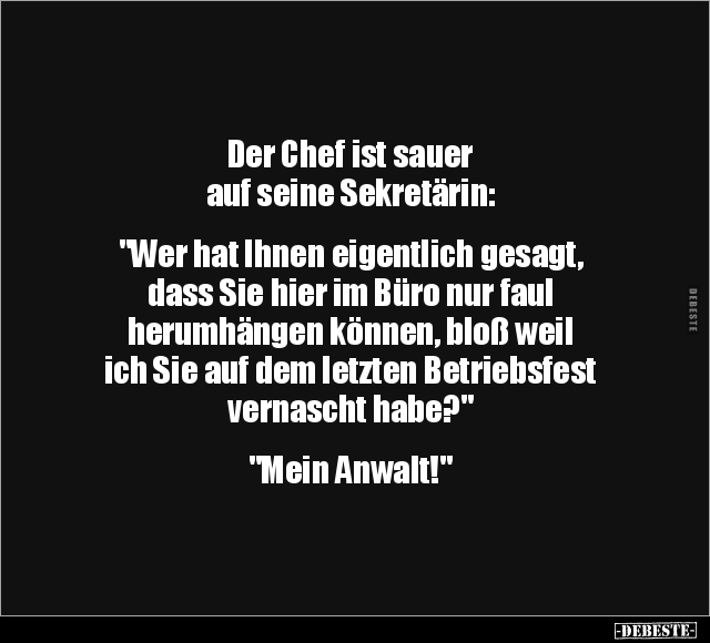 Der Chef ist sauer auf seine Sekretärin: "Wer hat Ihnen eigentlich gesagt, dass Sie hier im Büro nur faul herumhängen können, bloß weil ich Sie auf dem letzten Betriebsfest vernascht habe?" "Mein Anwalt!"