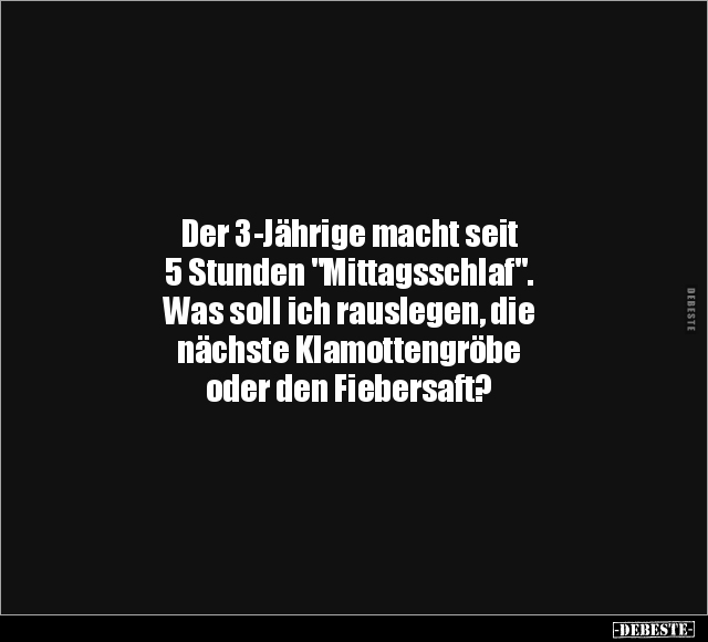 Der 3-Jährige macht seit 5 Stunden "Mittagsschlaf". Was soll ich rauslegen, die nächste Klamottengröbe oder den Fiebersaft?