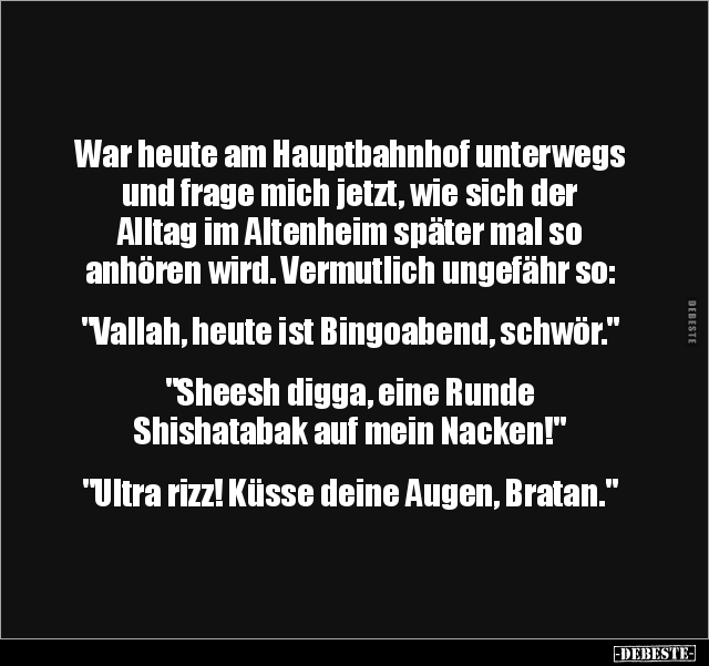 War heute am Hauptbahnhof unterwegs und frage mich jetzt, wie sich der Alltag im Altenheim später mal so anhören wird. Vermutlich ungefähr so: "Vallah, heute ist Bingoabend, schwör." "Sheesh digga, eine Runde Shishatabak auf mein Nacken!" "Ultra rizz! Küsse deine Augen, Bratan."