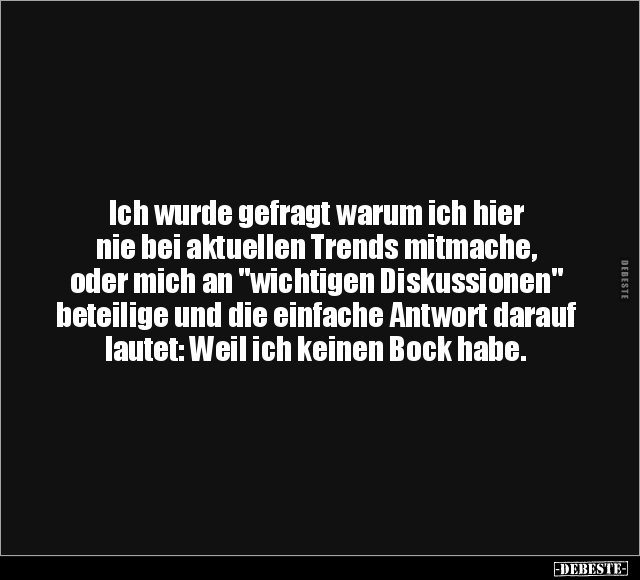 Ich wurde gefragt warum ich hier nie bei aktuellen Trends mitmache, oder mich an "wichtigen Diskussionen" beteilige und die einfache Antwort darauf lautet: Weil ich keinen Bock habe.