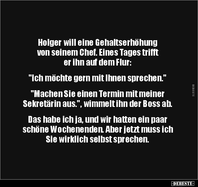 Holger will eine Gehaltserhöhung von seinem Chef. Eines Tages trifft er ihn auf dem Flur: "Ich möchte gern mit Ihnen sprechen." "Machen Sie einen Termin mit meiner Sekretärin aus.", wimmelt ihn der Boss ab. Das habe ich ja, und wir hatten ein paar schöne Wochenenden. Aber jetzt muss ich Sie wirklich selbst sprechen.