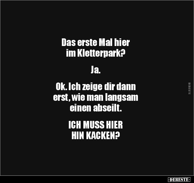 Das erste Mal hier im Kletterpark? Ja. Ok. Ich zeige dir dann erst, wie man langsam einen abseilt. ICH MUSS HIER HIN KACKEN?