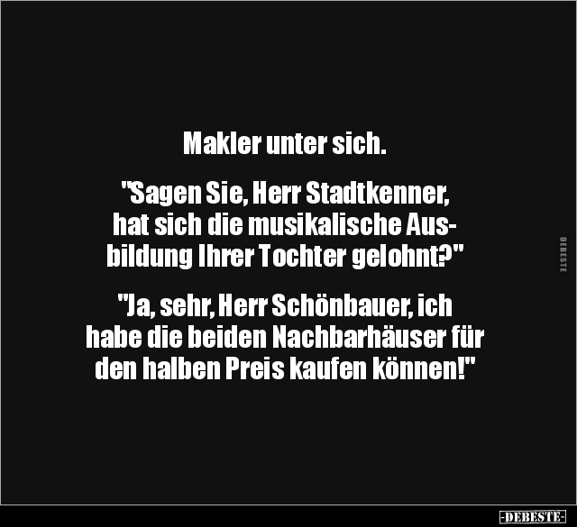 Makler unter sich. "Sagen Sie, Herr Stadtkenner, hat sich die musikalische Aus- bildung Ihrer Tochter gelohnt?" "Ja, sehr, Herr Schönbauer, ich habe die beiden Nachbarhäuser für den halben Preis kaufen können!"