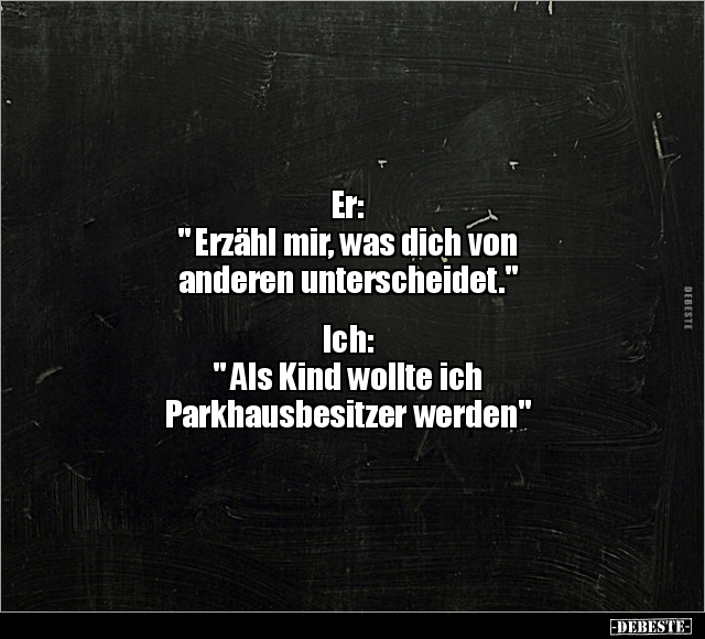 Er: " Erzähl mir, was dich von anderen unterscheidet." Ich: " Als Kind wollte ich Parkhausbesitzer werden"