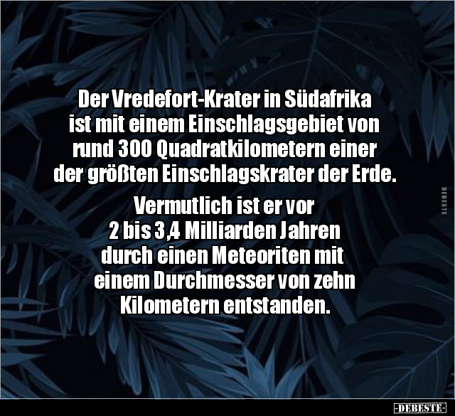 Der Vredefort-Krater in Südafrika ist mit einem Einschlagsgebiet von rund 300 Quadratkilometern einer der größten Einschlagskrater der Erde. Vermutlich ist er vor 2 bis 3,4 Milliarden Jahren durch einen Meteoriten mit einem Durchmesser von zehn Kilometern entstanden.