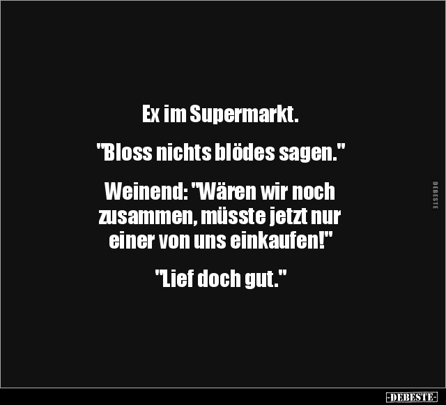 Ex im Supermarkt. "Bloss nichts blödes sagen." Weinend: "Wären wir noch zusammen, müsste jetzt nur einer von uns einkaufen!" "Lief doch gut."