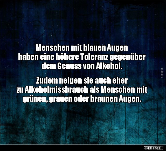 Menschen mit blauen Augen haben eine höhere Toleranz gegenüber dem Genuss von Alkohol. Zudem neigen sie auch eher zu Alkoholmissbrauch als Menschen mit grünen, grauen oder braunen Augen.