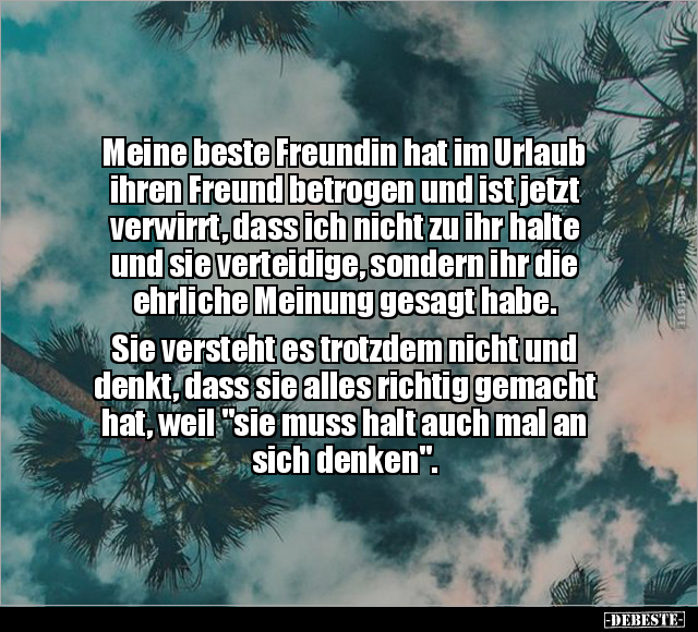 Meine beste Freundin hat im Urlaub ihren Freund betrogen und ist jetzt verwirrt, dass ich nicht zu ihr halte und sie verteidige, sondern ihr die ehrliche Meinung gesagt habe. Sie versteht es trotzdem nicht und denkt, dass sie alles richtig gemacht hat, weil "sie muss halt auch mal an sich denken".
