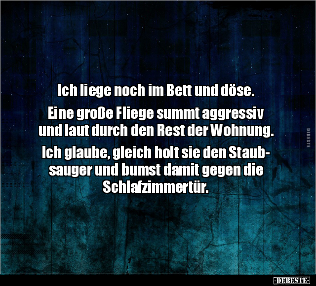 Ich liege noch im Bett und döse. Eine große Fliege summt aggressiv und laut durch den Rest der Wohnung. Ich glaube, gleich holt sie den Staub- sauger und bumst damit gegen die Schlafzimmertür.