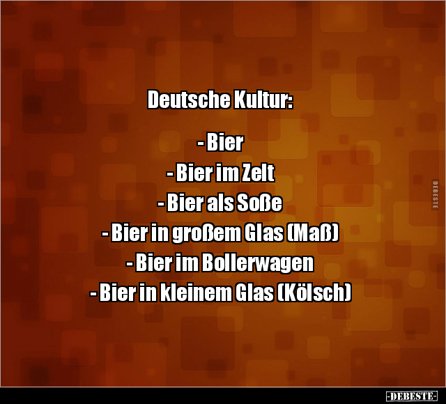 Deutsche Kultur: - Bier - Bier im Zelt - Bier als Soße - Bier in großem Glas (Maß) - Bier im Bollerwagen - Bier in kleinem Glas (Kölsch)