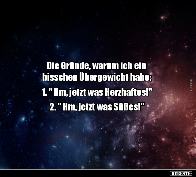 Die Gründe, warum ich ein bisschen Übergewicht habe: 1. " Hm, jetzt was Herzhaftes!" 2. " Hm, jetzt was Süßes!"
