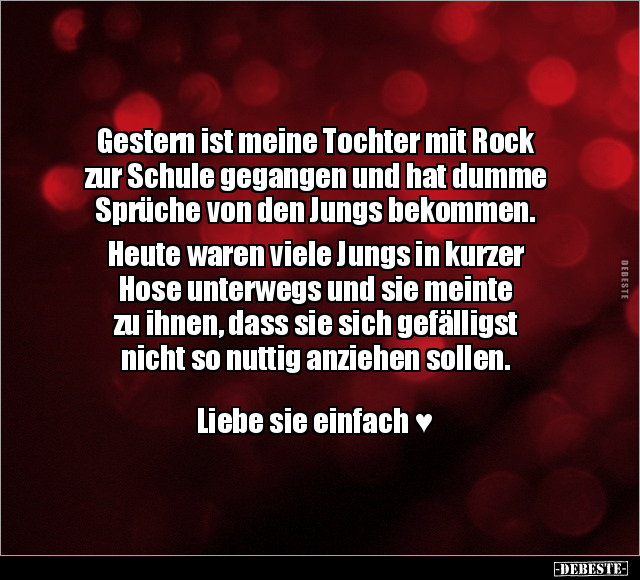 Gestern ist meine Tochter mit Rock zur Schule gegangen und hat dumme Sprüche von den Jungs bekommen. Heute waren viele Jungs in kurzer Hose unterwegs und sie meinte zu ihnen, dass sie sich gefälligst nicht so nuttig anziehen sollen. Liebe sie einfach ♥