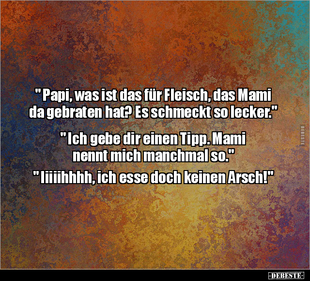 " Papi, was ist das für Fleisch, das Mami da gebraten hat? Es schmeckt so lecker." " Ich gebe dir einen Tipp. Mami nennt mich manchmal so." " Iiiiihhhh, ich esse doch keinen Arsch!"