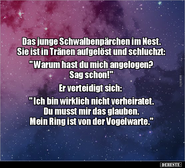 Das junge Schwalbenpärchen im Nest. Sie ist in Tränen aufgelöst und schluchzt: " Warum hast du mich angelogen? Sag schon!" Er verteidigt sich: " Ich bin wirklich nicht verheiratet. Du musst mir das glauben. Mein Ring ist von der Vogelwarte."