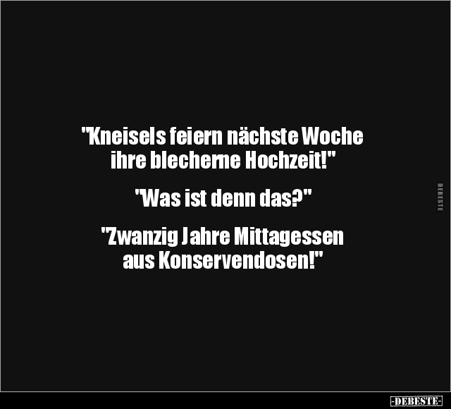 "Kneisels feiern nächste Woche ihre blecherne Hochzeit!" "Was ist denn das?" "Zwanzig Jahre Mittagessen aus Konservendosen!"