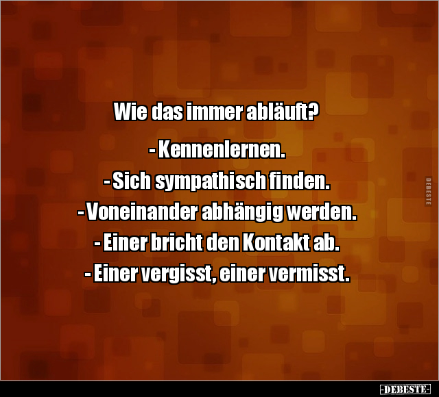 Wie das immer abläuft? - Kennenlernen. - Sich sympathisch finden. - Voneinander abhängig werden. - Einer bricht den Kontakt ab. - Einer vergisst, einer vermisst.
