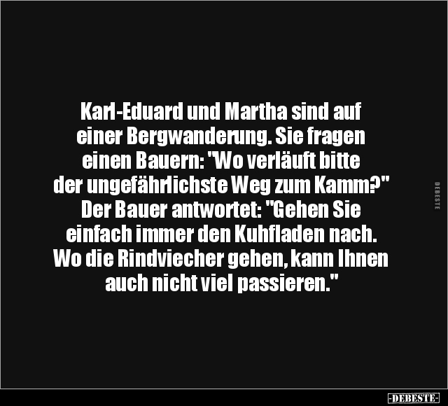 Karl-Eduard und Martha sind auf einer Bergwanderung. Sie fragen einen Bauern: "Wo verläuft bitte der ungefährlichste Weg zum Kamm?" Der Bauer antwortet: "Gehen Sie einfach immer den Kuhfladen nach. Wo die Rindviecher gehen, kann Ihnen auch nicht viel passieren."