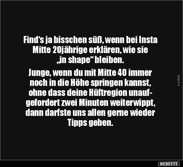 Find‘s ja bisschen süß, wenn bei Insta Mitte 20jährige erklären, wie sie „in shape“ bleiben. Junge, wenn du mit Mitte 40 immer noch in die Höhe springen kannst, ohne dass deine Hüftregion unauf- gefordert zwei Minuten weiterwippt, dann darfste uns allen gerne wieder Tipps geben.