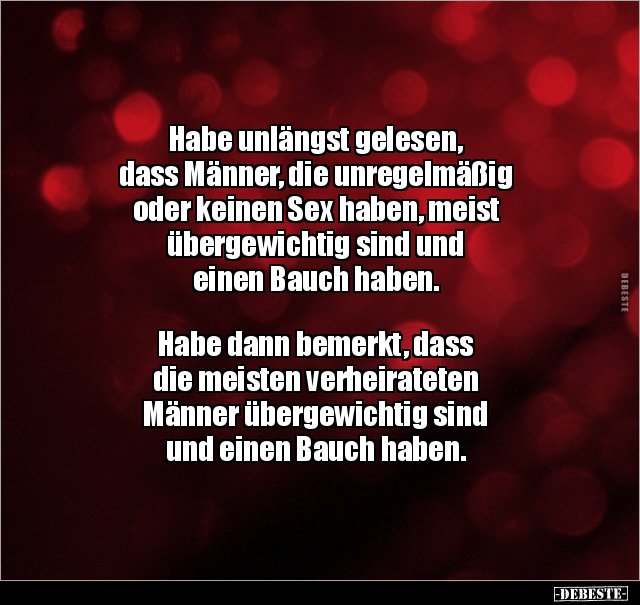 Habe unlängst gelesen, dass Männer, die unregelmäßig oder keinen Sex haben, meist übergewichtig sind und einen Bauch haben. Habe dann bemerkt, dass die meisten verheirateten Männer übergewichtig sind und einen Bauch haben.