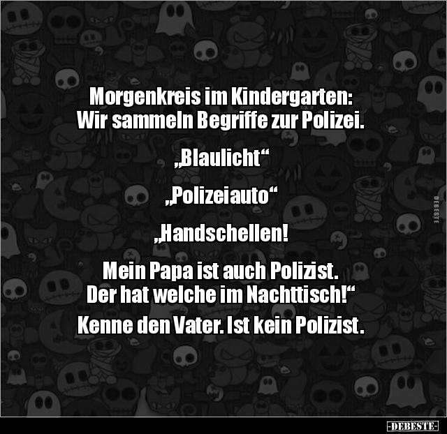 Morgenkreis im Kindergarten: Wir sammeln Begriffe zur Polizei. „Blaulicht“ „Polizeiauto“ „Handschellen! Mein Papa ist auch Polizist. Der hat welche im Nachttisch!“ Kenne den Vater. Ist kein Polizist.