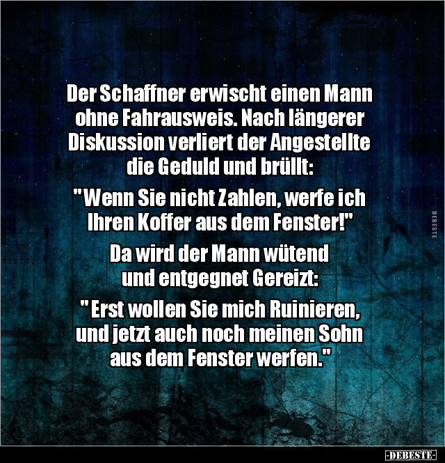 Der Schaffner erwischt einen Mann ohne Fahrausweis. Nach längerer Diskussion verliert der Angestellte die Geduld und brüllt: " Wenn Sie nicht Zahlen, werfe ich Ihren Koffer aus dem Fenster!" Da wird der Mann wütend und entgegnet Gereizt: " Erst wollen Sie mich Ruinieren, und jetzt auch noch meinen Sohn aus dem Fenster werfen."
