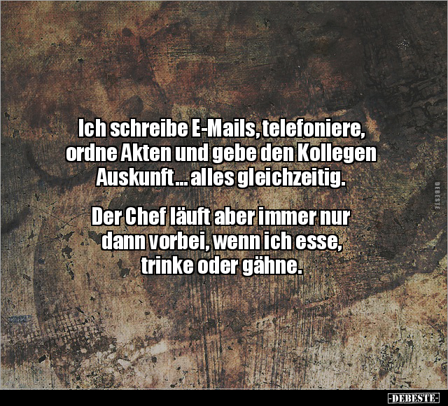 Ich schreibe E-Mails, telefoniere, ordne Akten und gebe den Kollegen Auskunft… alles gleichzeitig. Der Chef läuft aber immer nur dann vorbei, wenn ich esse, trinke oder gähne.