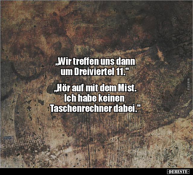 „Wir treffen uns dann um Dreiviertel 11." „Hör auf mit dem Mist. Ich habe keinen Taschenrechner dabei."