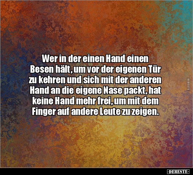 Wer in der einen Hand einen Besen hält, um vor der eigenen Tür zu kehren und sich mit der anderen Hand an die eigene Nase packt, hat keine Hand mehr frei, um mit dem Finger auf andere Leute zu zeigen.
