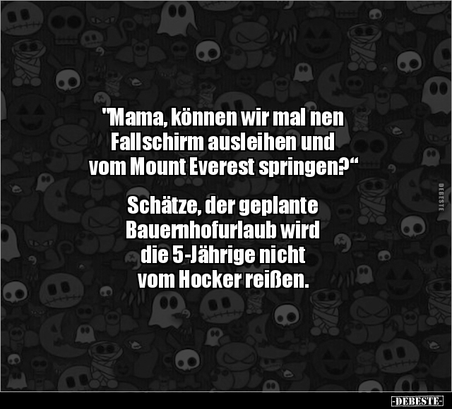 "Mama, können wir mal nen Fallschirm ausleihen und vom Mount Everest springen?“ Schätze, der geplante Bauernhofurlaub wird die 5-Jährige nicht vom Hocker reißen.