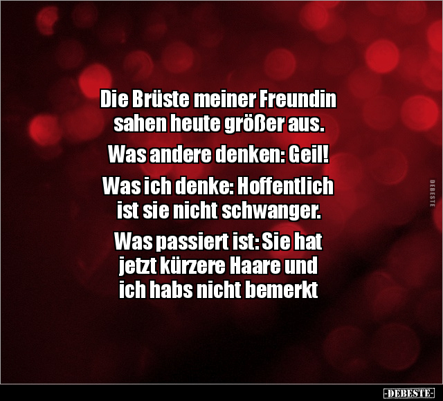 Die Brüste meiner Freundin sahen heute größer aus. Was andere denken: Geil! Was ich denke: Hoffentlich ist sie nicht schwanger. Was passiert ist: Sie hat jetzt kürzere Haare und ich habs nicht bemerkt