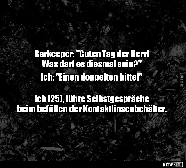 Barkeeper: "Guten Tag der Herr! Was darf es diesmal sein?" Ich: "Einen doppelten bitte!" Ich (25), führe Selbstgespräche beim befüllen der Kontaktlinsenbehälter.