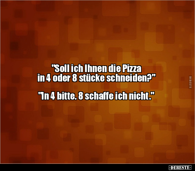 "Soll ich Ihnen die Pizza in 4 oder 8 stücke schneiden?" "In 4 bitte. 8 schaffe ich nicht."