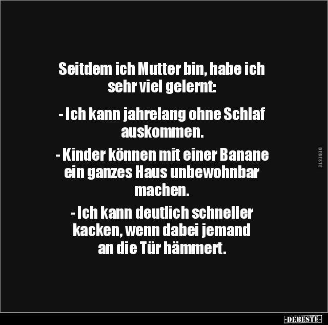 Seitdem ich Mutter bin, habe ich sehr viel gelernt: - Ich kann jahrelang ohne Schlaf auskommen. - Kinder können mit einer Banane ein ganzes Haus unbewohnbar machen. - Ich kann deutlich schneller kacken, wenn dabei jemand an die Tür hämmert.