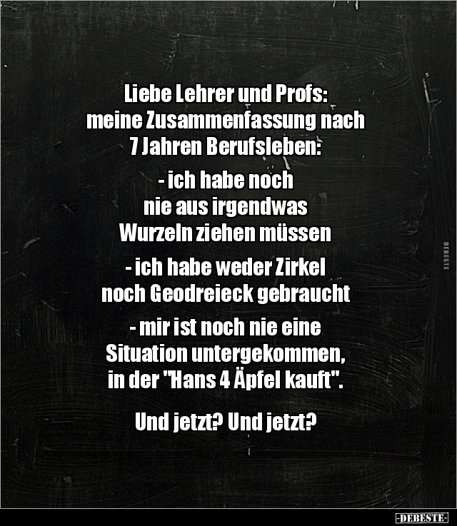 Liebe Lehrer und Profs: meine Zusammenfassung nach 7 Jahren Berufsleben: - ich habe noch nie aus irgendwas Wurzeln ziehen müssen - ich habe weder Zirkel noch Geodreieck gebraucht - mir ist noch nie eine Situation untergekommen, in der "Hans 4 Äpfel kauft". Und jetzt? Und jetzt?