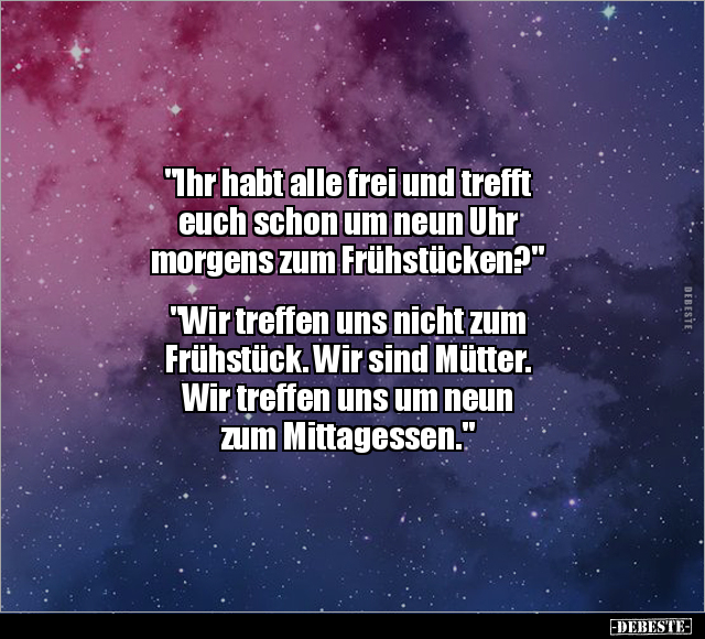 "Ihr habt alle frei und trefft euch schon um neun Uhr morgens zum Frühstücken?" "Wir treffen uns nicht zum Frühstück. Wir sind Mütter. Wir treffen uns um neun zum Mittagessen."