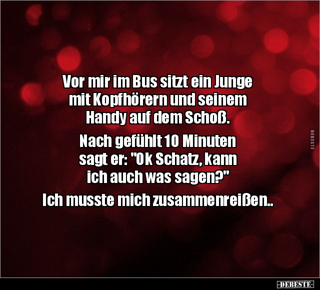 Vor mir im Bus sitzt ein Junge mit Kopfhörern und seinem Handy auf dem Schoß. Nach gefühlt 10 Minuten sagt er: "Ok Schatz, kann ich auch was sagen?" Ich musste mich zusammenreißen..