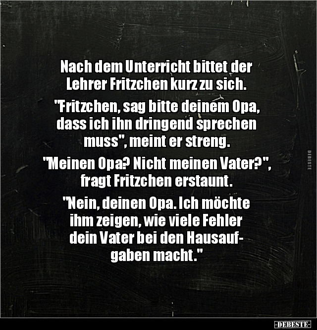 Nach dem Unterricht bittet der Lehrer Fritzchen kurz zu sich. "Fritzchen, sag bitte deinem Opa, dass ich ihn dringend sprechen muss", meint er streng. "Meinen Opa? Nicht meinen Vater?", fragt Fritzchen erstaunt. "Nein, deinen Opa. Ich möchte ihm zeigen, wie viele Fehler dein Vater bei den Hausauf- gaben macht."