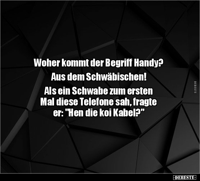 Woher kommt der Begriff Handy? Aus dem Schwäbischen! Als ein Schwabe zum ersten Mal diese Telefone sah, fragte er: "Hen die koi Kabel?"