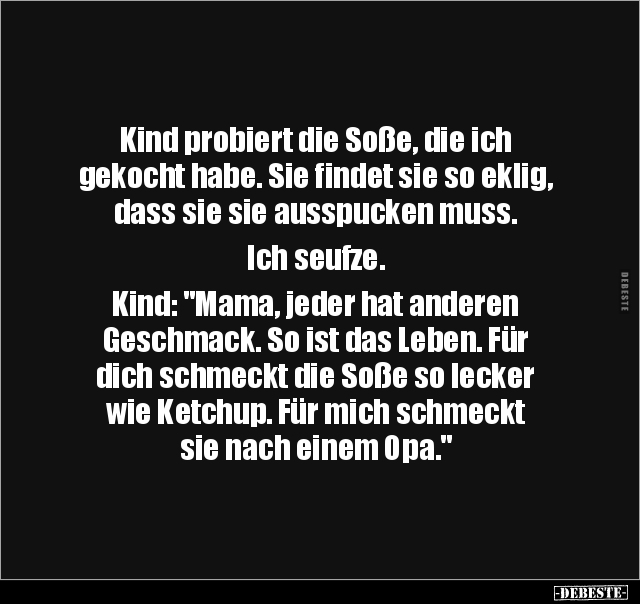 Kind probiert die Soße, die ich gekocht habe. Sie findet sie so eklig, dass sie sie ausspucken muss. Ich seufze. Kind: "Mama, jeder hat anderen Geschmack. So ist das Leben. Für dich schmeckt die Soße so lecker wie Ketchup. Für mich schmeckt sie nach einem Oра."