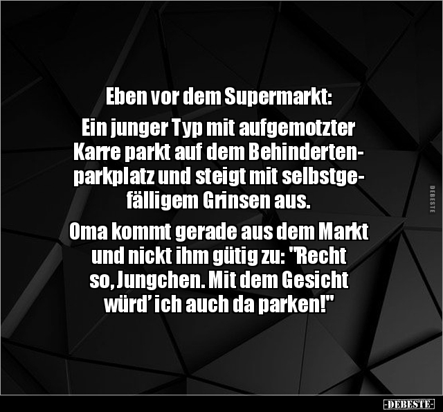 Eben vor dem Supermarkt: Ein junger Typ mit aufgemotzter Karre parkt auf dem Behinderten- parkplatz und steigt mit selbstge- fälligem Grinsen aus. Oma kommt gerade aus dem Markt und nickt ihm gütig zu: "Recht so, Jungchen. Mit dem Gesicht würd’ ich auch da parken!"