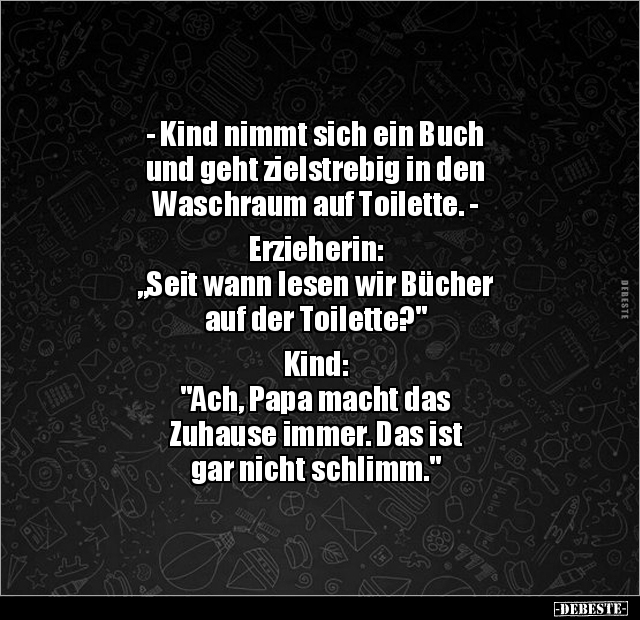 - Kind nimmt sich ein Buch und geht zielstrebig in den Waschraum auf Toilette. - Erzieherin: „Seit wann lesen wir Bücher auf der Toilette?" Kind: "Ach, Papa macht das Zuhause immer. Das ist gar nicht schlimm."
