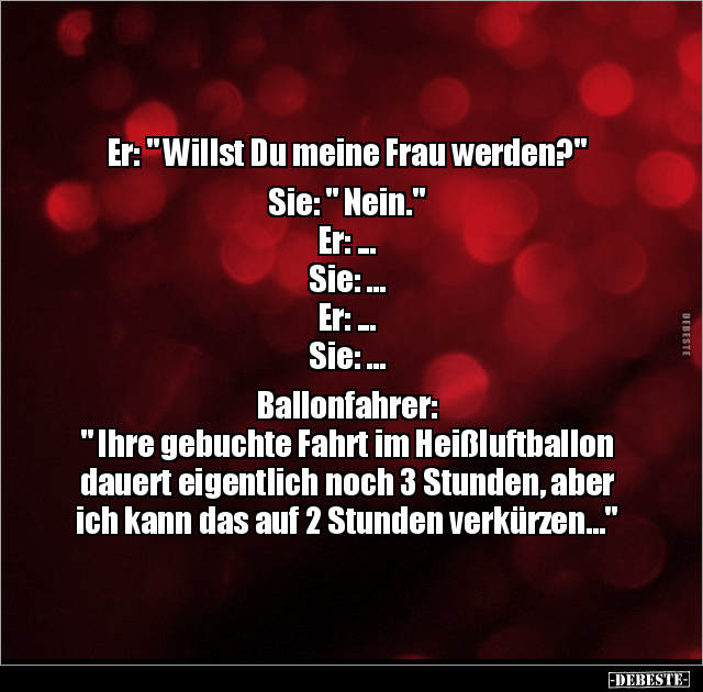 Er: " Willst Du meine Frau werden?" Sie: " Nein." Er: ... Sie: ... Er: ... Sie: ... Ballonfahrer: " Ihre gebuchte Fahrt im Heißluftballon dauert eigentlich noch 3 Stunden, aber ich kann das auf 2 Stunden verkürzen..."