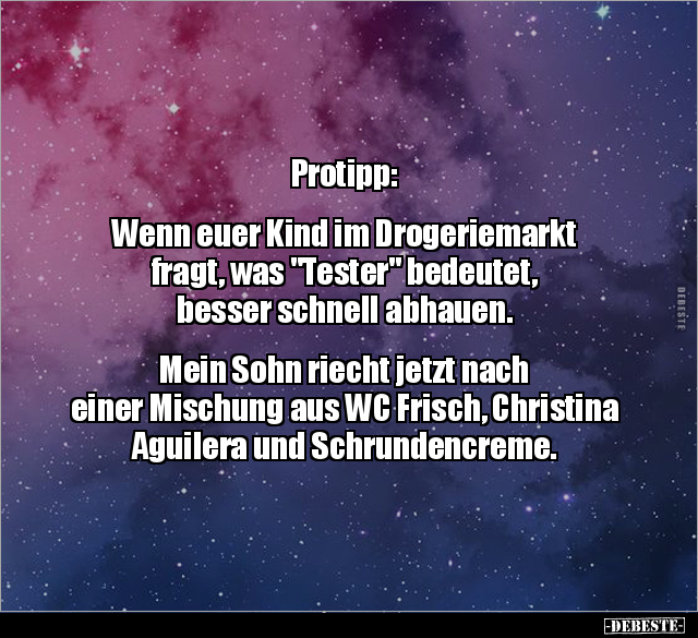 Protipp: Wenn euer Kind im Drogeriemarkt fragt, was "Tester" bedeutet, besser schnell abhauen. Mein Sohn riecht jetzt nach einer Mischung aus WC Frisch, Christina Aguilera und Schrundencreme.