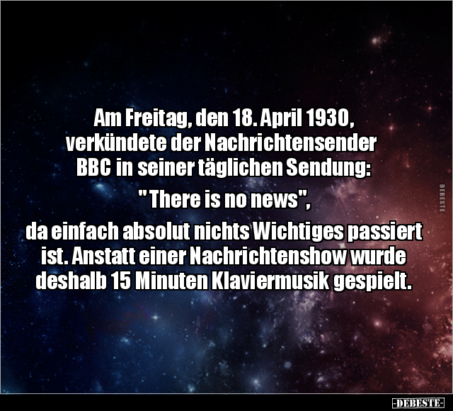 Am Freitag, den 18. April 1930, verkündete der Nachrichtensender BBC in seiner täglichen Sendung: " There is no news", da einfach absolut nichts Wichtiges passiert ist. Anstatt einer Nachrichtenshow wurde deshalb 15 Minuten Klaviermusik gespielt.