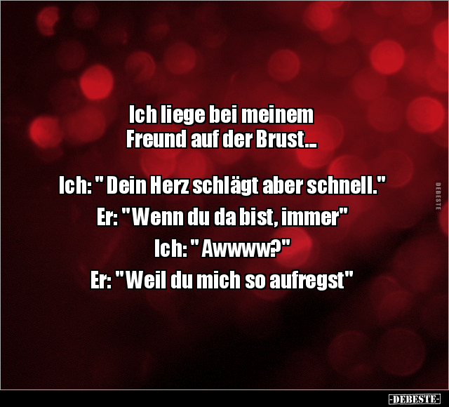 Ich liege bei meinem Freund auf der Brust... Ich: " Dein Herz schlägt aber schnell." Er: " Wenn du da bist, immer" Ich: " Awwww?" Er: " Weil du mich so aufregst"