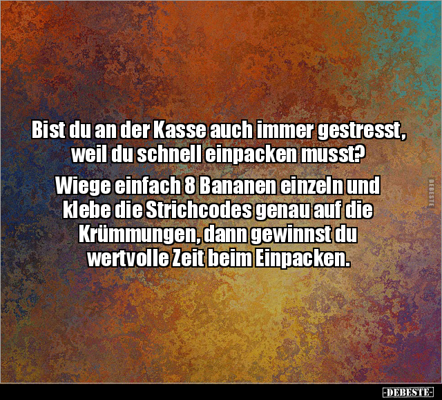 Bist du an der Kasse auch immer gestresst, weil du schnell einpacken musst? Wiege einfach 8 Bananen einzeln und klebe die Strichcodes genau auf die Krümmungen, dann gewinnst du wertvolle Zeit beim Einpacken.
